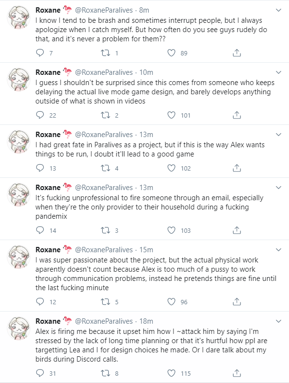 Plus, I don’t need to point out that Roxane is clearly upset about Alex’s decision to fire her. She was actually on a six-months probation period, and it was decided to not renew her contract. I feel for her, but I don’t approve any of her tweets. All of them are unprofessional and offensive towards Alex Massé and all the Paralives Team.
